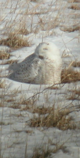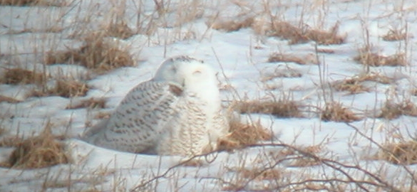 These are pictures of the Snowy Owl near Willow Hill in Franklin County on 1/23/2004. The owl was 200-300 feet away from the scope that I used to take the pictures. The scope is a Swarovski ST80HD with a 20-60x zoom lens and the pictures were taken at 60x by holding a compact digital Minolta Dimage X up to the lens. The only variation was the direction of the owl's head, so you will see: front, left , right , and back views. Cloud cover was 20%, temperature 15F (estimated), and windy. The original pictures have been trimmed and reduced for use on the web.